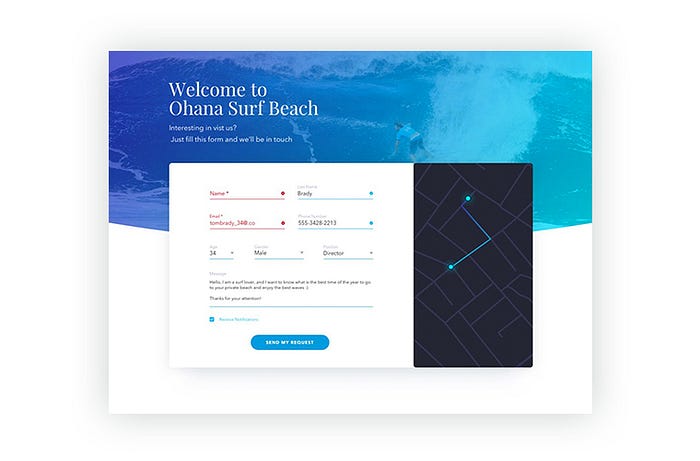 Ürün tasarımcısı Leo Zakour’un mobil arayüzler için tasarladığı iletişim formu. Kullanıcı formu doldururken hem hangi text alanına veri girişi yaptığını hem de formun yüzde kaçını doldurduğunu görebiliyor. İletişim formunun arayüzü 2 farklı renk kullanımıyla basit tutularak interaksiyonu doğru şekilde kurduğu için kullanıcının kolay odaklamasını sağlıyor. Portfolyosunda da görüleceği üzere, Zakour en küçük detay arayüz tasarımlarında da minimal ilerlemeyi tercih ediyor.