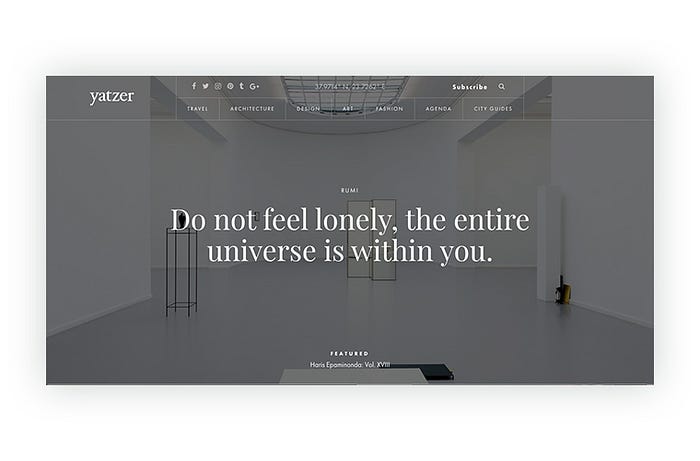 Bir tasarım blogu olarak yayın yapan Yatzer ile 2008–2009 yıllarnda tanıştım. Yatzer, 2 yıl önce arayüz tasarımını güncelledi. Yeni tasarımda, karşılama ekranında kullanılan tam ekran görsel ve ortalı başlık ile kullanıcıyı blog içeriğine yönlendiriyor. Arka plandaki özenle seçilmiş sade görsel ve üzerinde kullanılan modern yazı tipiyle oluşturulan minimal arayüz gerçekten etkileyici.