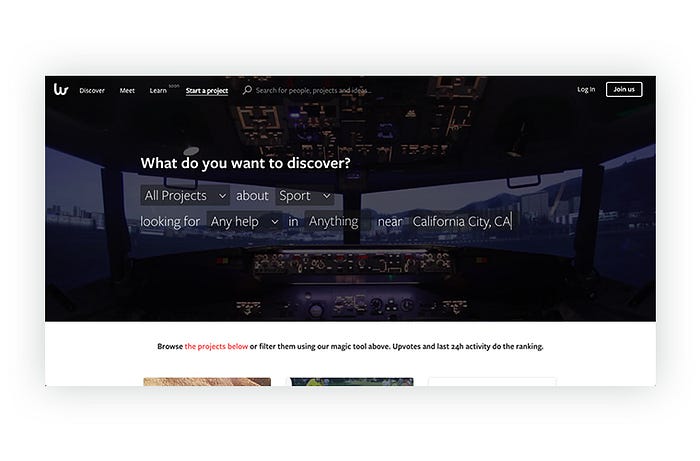 Proje tanıtım ve destek içeriğine sahip Wittycircle çatısı altında yeni projelerin tanıtıldığı Discover sayfasının karşılama ekranı, arka planında proje sahiplerine ait videoları, üzerinde cümle içinde form alanlarını kullanıcılarına “Ne keşfetmek istersiniz?” mesajıyla birlikte veriyor. Video, tipografi ve form deneyimiyle arayüz tasarımında akılda kalıcı olmayı başarıyor.