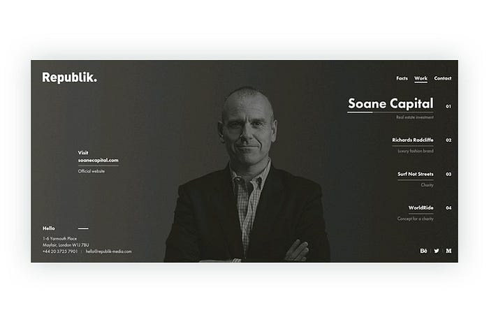 Londra merkezli Republik reklam ajansının karizmatik web sitesinde sizi ilk karşılayan “yükleniyor” (loading) ekranı oluyor. Tek renk üzerinde kullandıklarıkısa bir motto ile karşılama ekranına yönlendiriyor. Republik bize “işler” sayfasını karşılama ekranı olarak sunuyor. Burada tam ekrana yayılan ilgili bir görsel kullanımı ve üzerinde kalın yazı tipiyle ön plana çıkartılmış proje isimlerine yer verilmiş. Arayüz tasarımıyla vegeçiş animasyonula okunabilir, anlaşılabilir ve minimal bir arayüz tasarımına sahip.